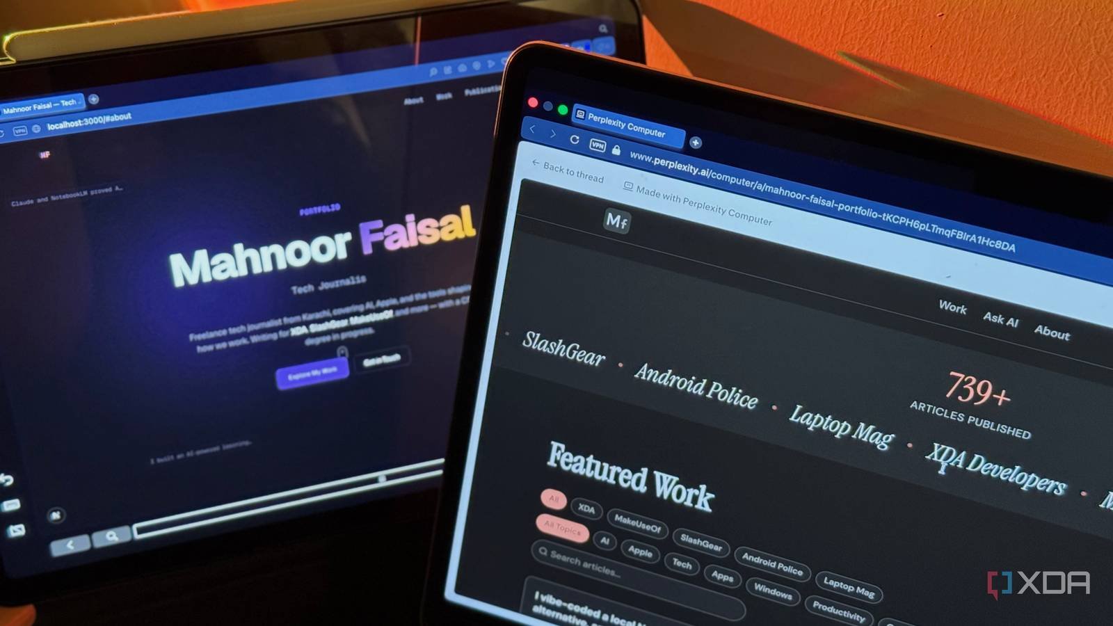 Once I sent him my idea, he asked me a couple of follow-up questions, including the visual vibe I wanted, the core audience, a photo of me, and if I had a website or portfolio whose vibe I loved. Then it took off and started building! He delegated the task of compiling my articles to Gemini 3 Flash, while Claude Opus 4.6 took care of the coding. I hadn’t specified a design vibe and gave the tools the freedom to decide. Perplexity Computer opted for warm cream and coral tones, had a photo of me on the cover, and a typewriter-style tagline that alternated between different phrases about me. This included technology journalist, computer science student, NotebookLM evangelist, professional charlatan (which he pulled from my Instagram)!