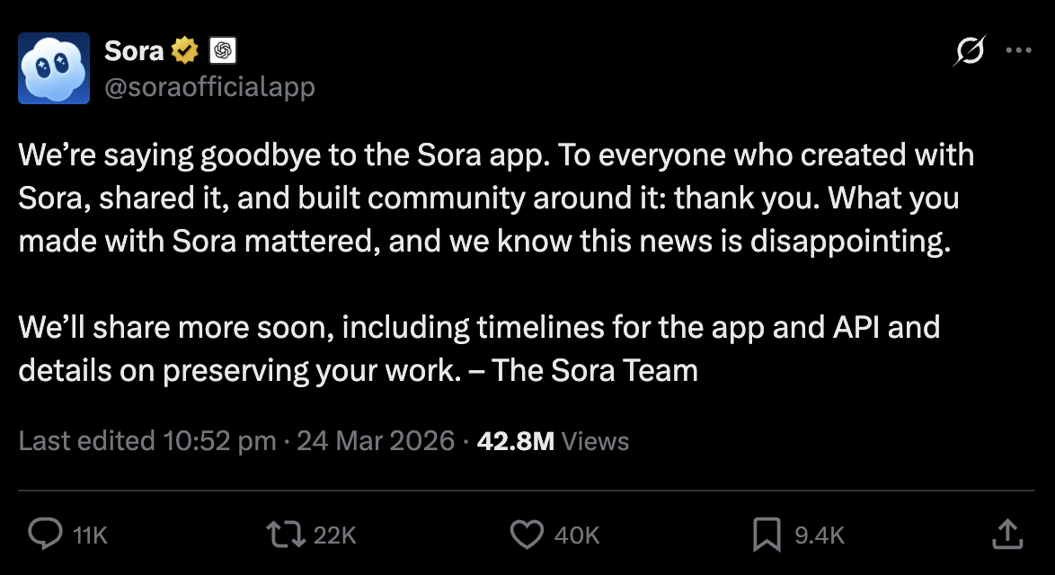 The announcement was made through a post on X by the Sora team, which confirmed the closure of the platform. They also mentioned that additional details on the closure timeline, API access, and efforts to preserve work would be provided later.