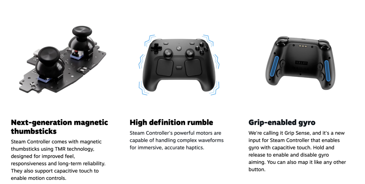 The dual trackpads follow the design of the original Steam Controller, allowing for more natural play of PC games that weren’t originally intended for controllers. The addition of a dual joystick design addresses a key limitation of the original for games that already support standard gamepad input.
